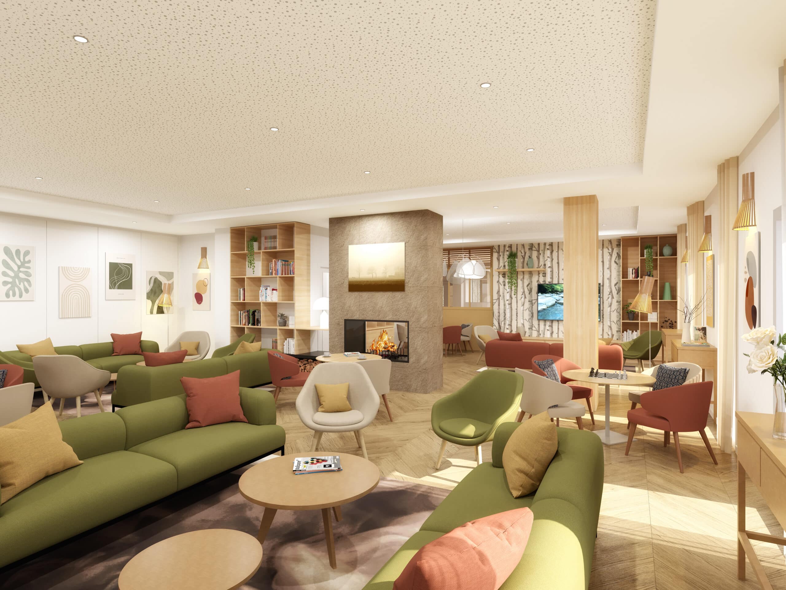 Pour accompagner la vie quotidienne, la résidence propose plusieurs espaces chaleureux ouverts aux seniors et inclus dans le loyer : un salon avec cheminée, un restaurant, une salle bien-être, des espaces verts et un parking privé.